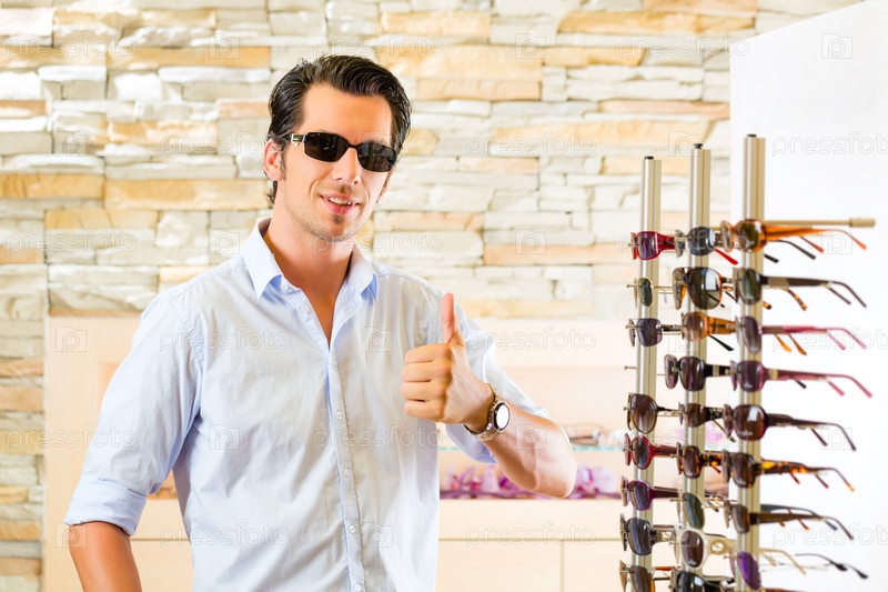 Молодой человек в оптике выбирает очки
