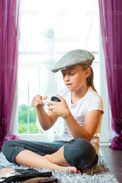 Девочка в кепке сидит на полу в комнате и делает макияж