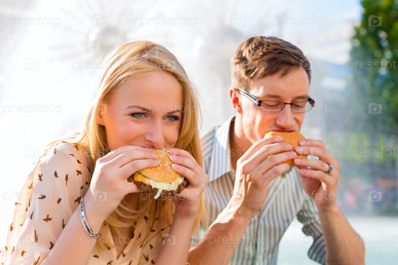 Пара ест гамбургер на солнечной улице