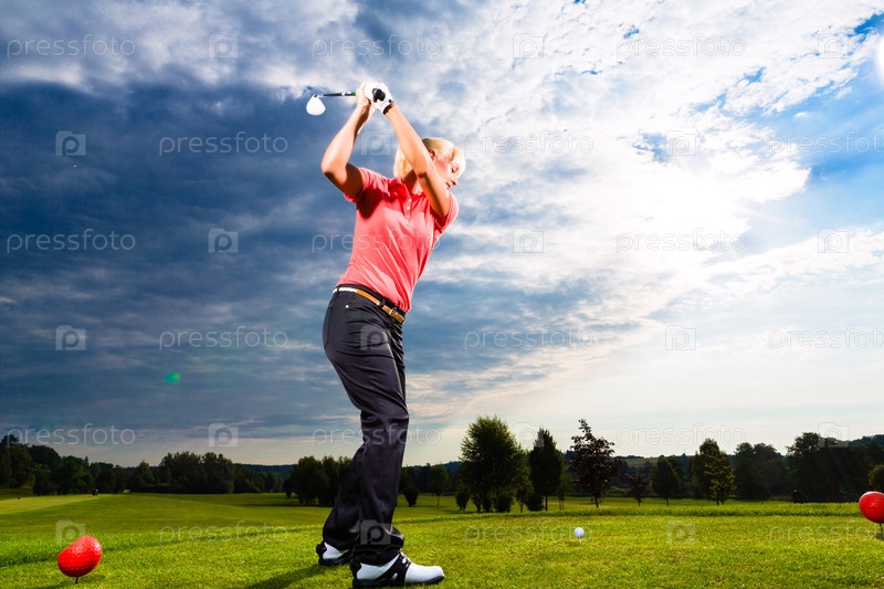 Молодая гольфистка делает удар по мячу