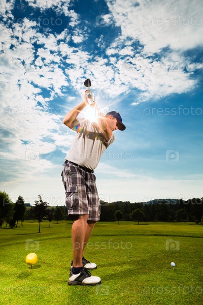 Молодой гольфист делает удар по мячу