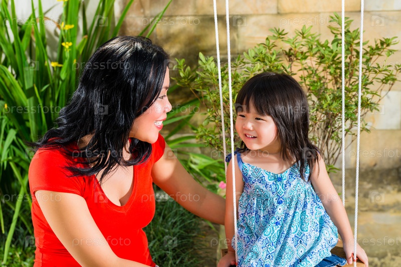 Азиатская мама с дочкой в саду
