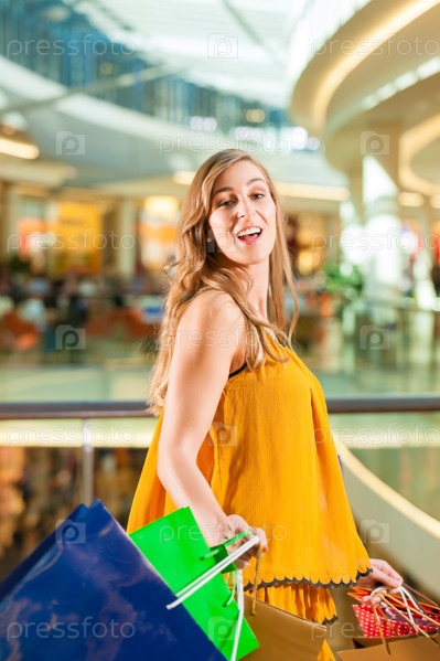 Молодая счастливая женщина с пакетами после покупок в торговом центре