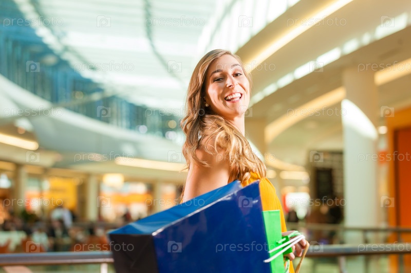 Молодая счастливая женщина с пакетами после покупок в торговом центре