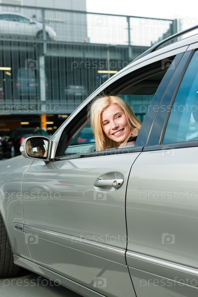 Женщина на парковке смотрит из окна автомобиля назад
