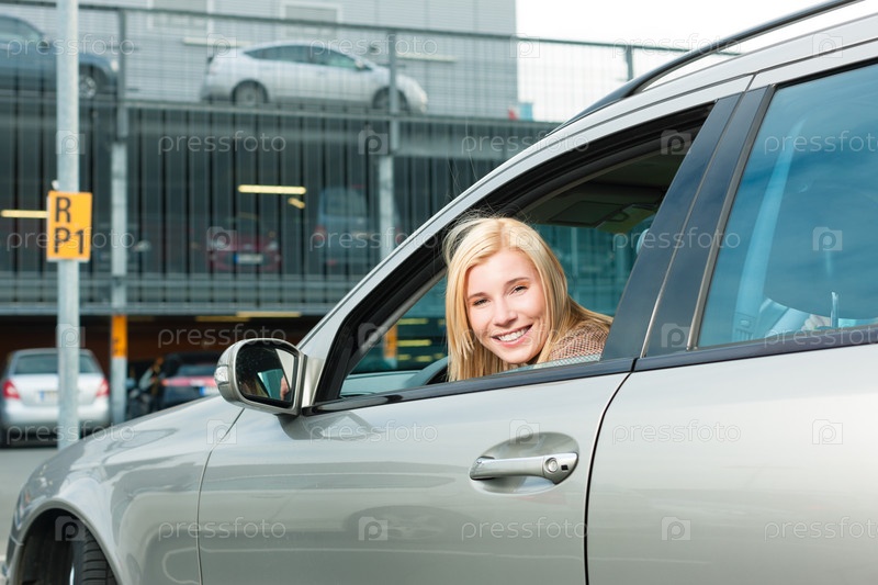 Женщина на парковке смотрит из окна автомобиля назад