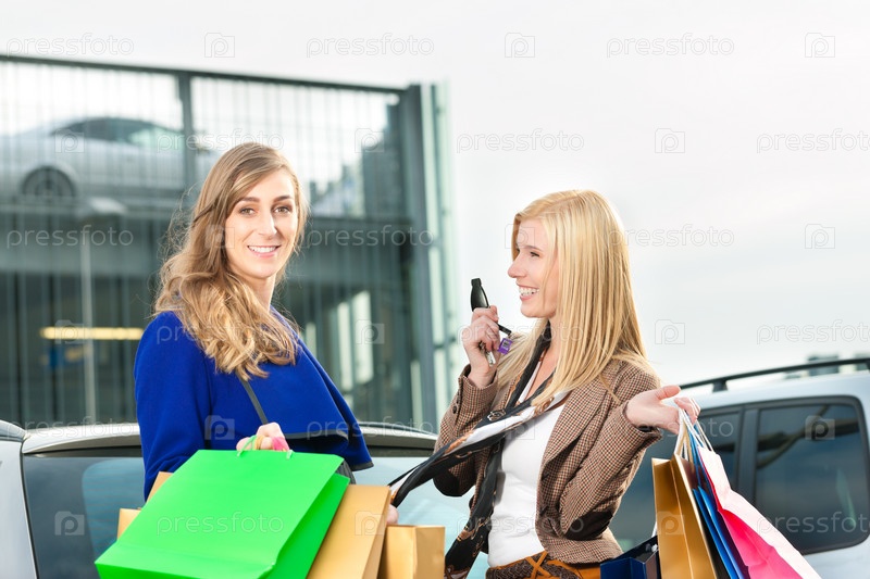 Две женщины с покупками у торгового центра собираются ехать домой на автомобиле
