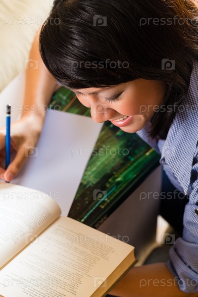 Девушка занимается с кучей книг