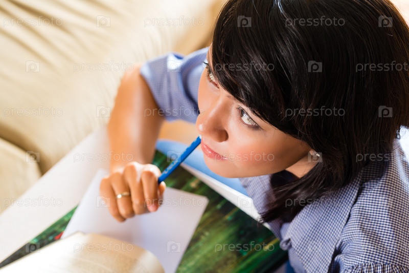 Девушка занимается с кучей книг