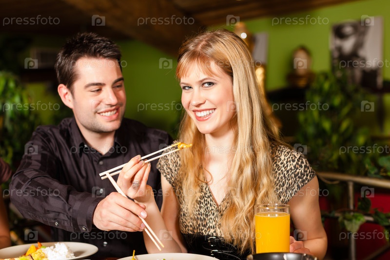 Молодые люди палочками едят в ресторане