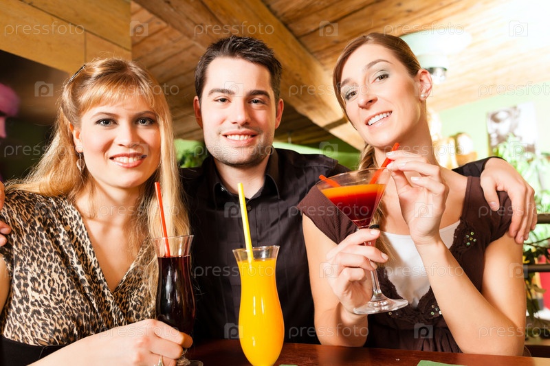 Молодые счастливые люди пьют коктейли на вечеринке в баре или ресторане