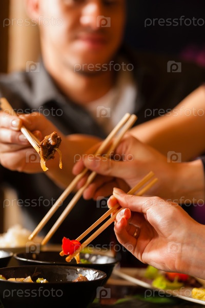 Молодые люди палочками едят в ресторане