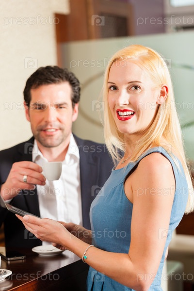 Коллеги - мужчина и женщина работают и пьют кофе в кафе