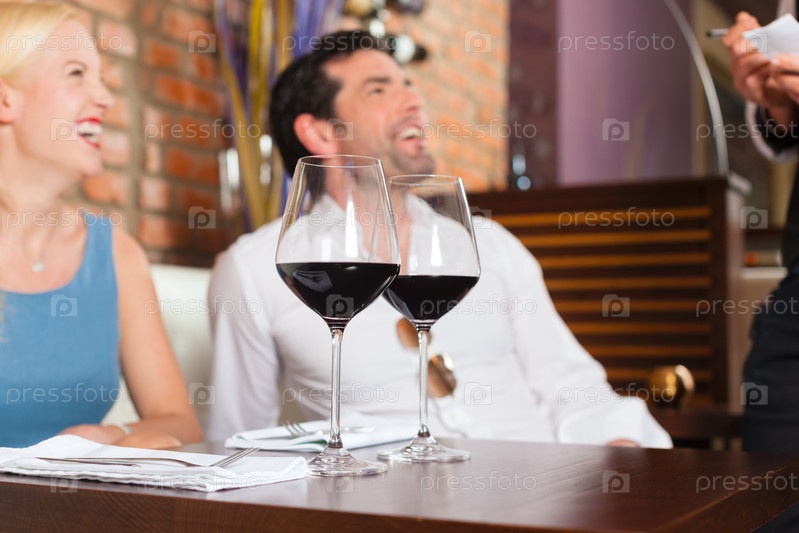 Привлекательная пара пьет красное вино в ресторане, а официант принимает заказ