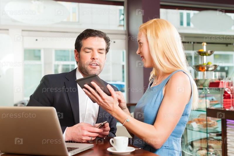 Коллеги - мужчина и женщина работают и пьют кофе в кафе