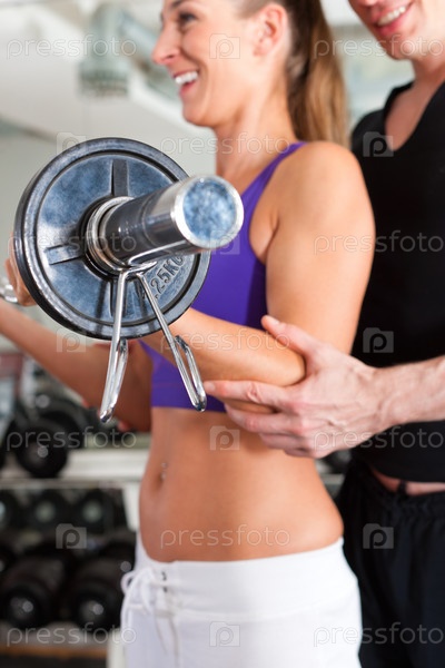 Молодая пара занимается в тренажерном зале. Мужчина - личный тренер