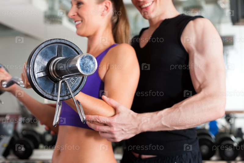 Молодая пара занимается в тренажерном зале. Мужчина - личный тренер