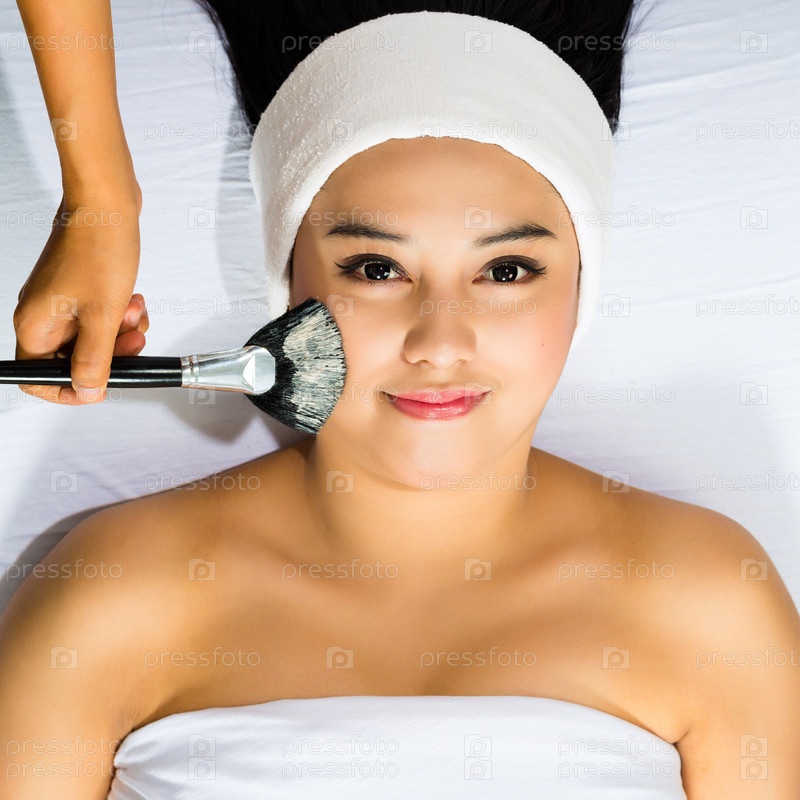 Косметолог делает азиатской женщине маску на лице