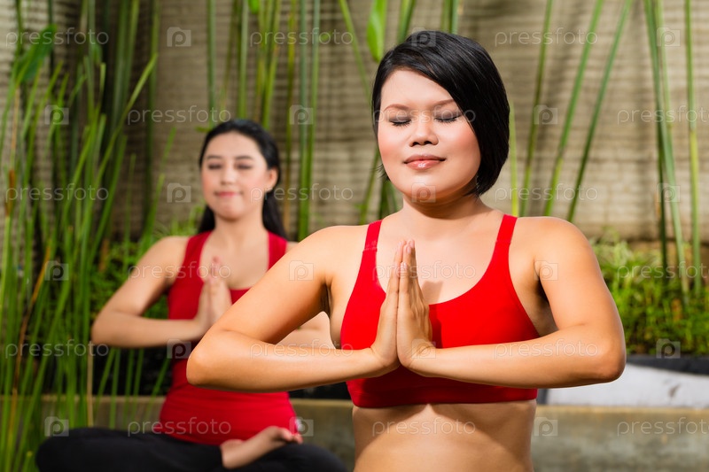 Азиатские женщины занимаются йогой в тропическом месте