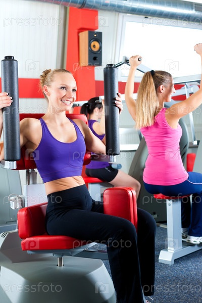 Три молодые женщины занимаются в тренажерном зале