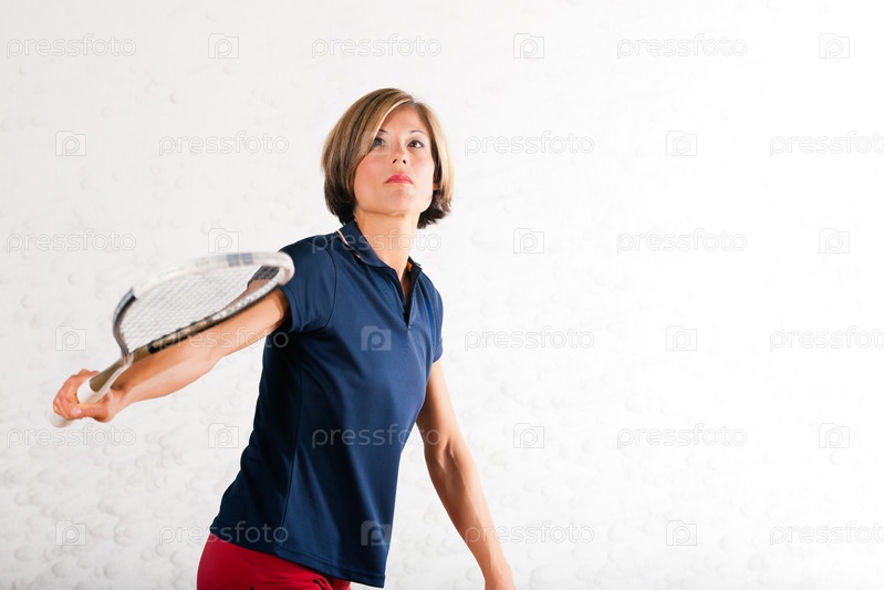 Взрослая женщина играют в сквош в зале