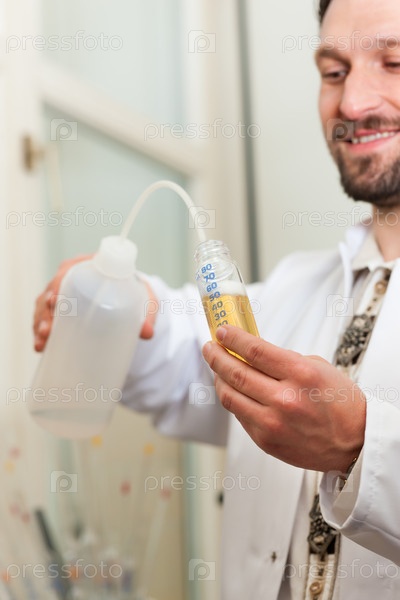 Технолог в лаборатории пивоваренного завода делает анализ