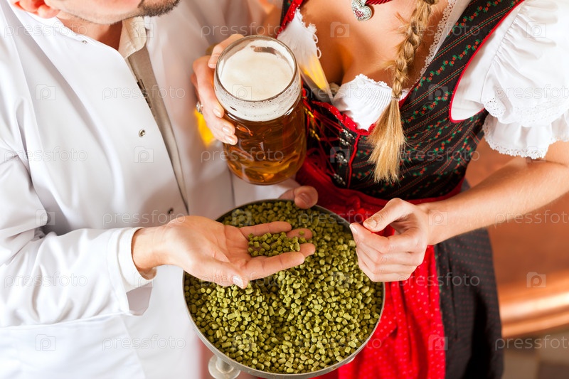 Женщина в баварском костюме и мужчина с пивом в собственной пивоварне