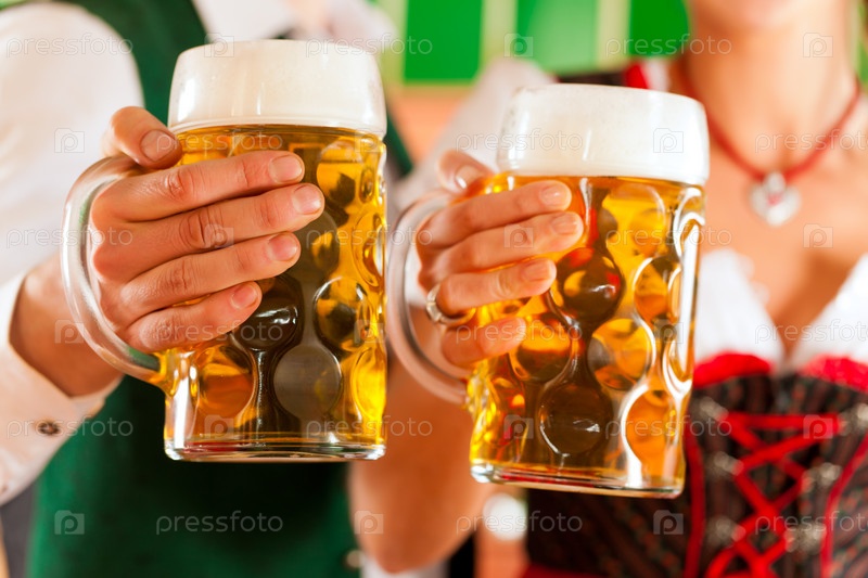 Мужчина и женщина в баварским костюмах с пивом в пивоварне