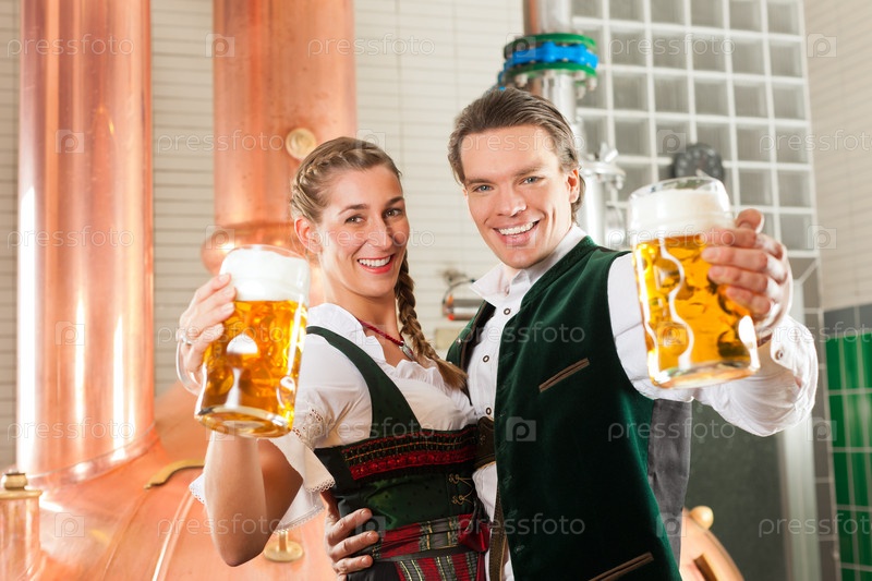 Мужчина и женщина в баварским костюмах с пивом в пивоварне