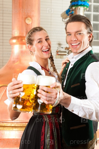 Мужчина и женщина в баварским костюмах с пивом в пивоварне