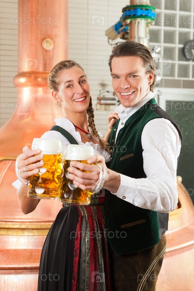 Мужчина и женщина в баварским костюмах с пивом в пивоварне