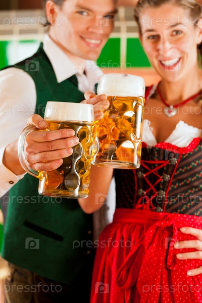 Мужчина и женщина в баварским костюмах с пивом в пивоварне