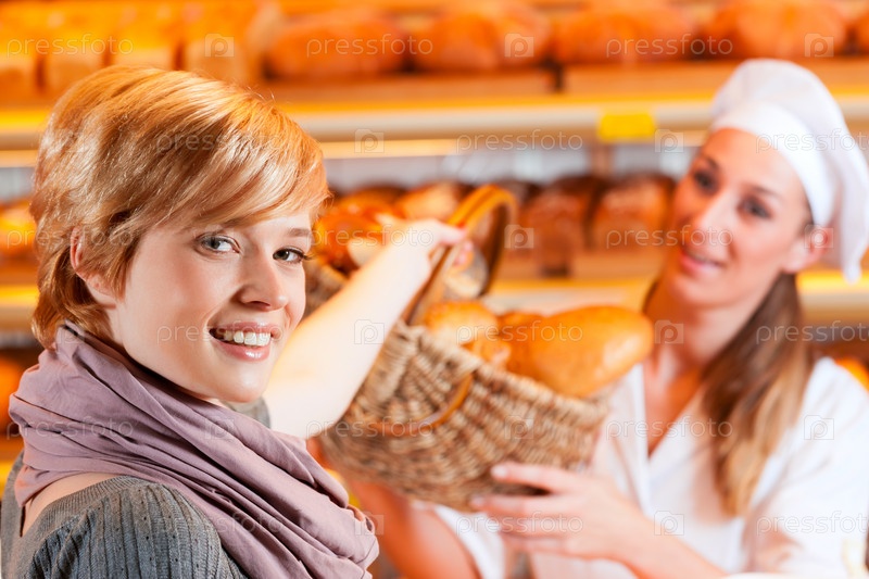 Женщина-пекарь с клиенткой в магазине свежей выпечки