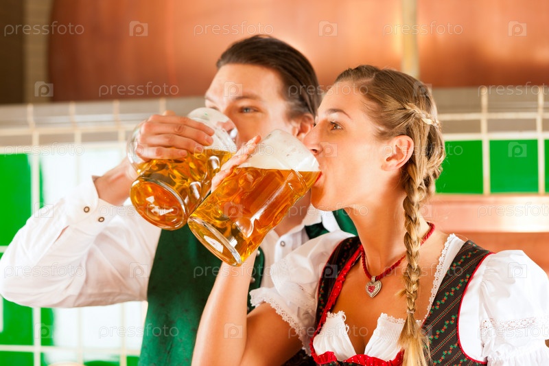 Мужчина и женщина в баварским костюмах с пивом в пивоварне