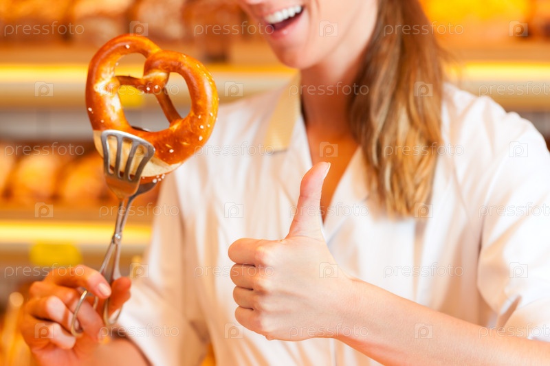 Продавец в пекарне протягивает крендель клиенту