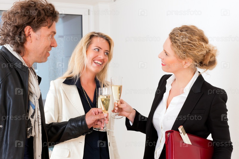 Риэлтор и молодая пара празднуют удачную сделку