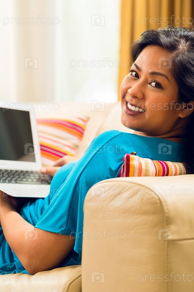 Улыбающаяся азиатская женщина сидит в интернет на диване