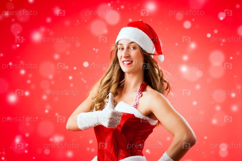Привлекательная молодая женщина в костюме Санта-Клауса с большим пальцем вверх