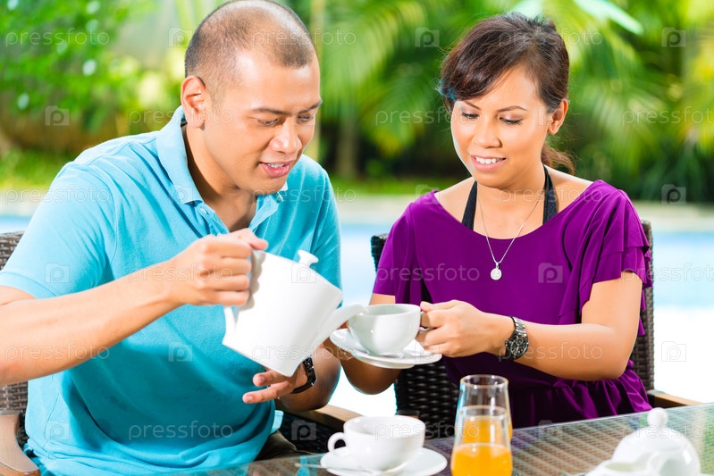 Азиатская пара пьет кофе на веранде дома