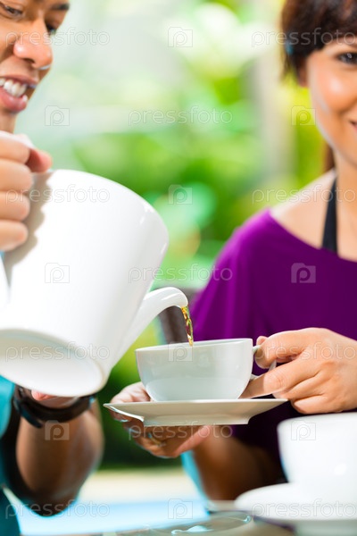 Азиатская пара пьет кофе на веранде дома