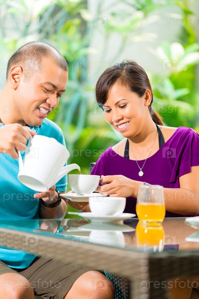 Азиатская пара пьет кофе на веранде дома