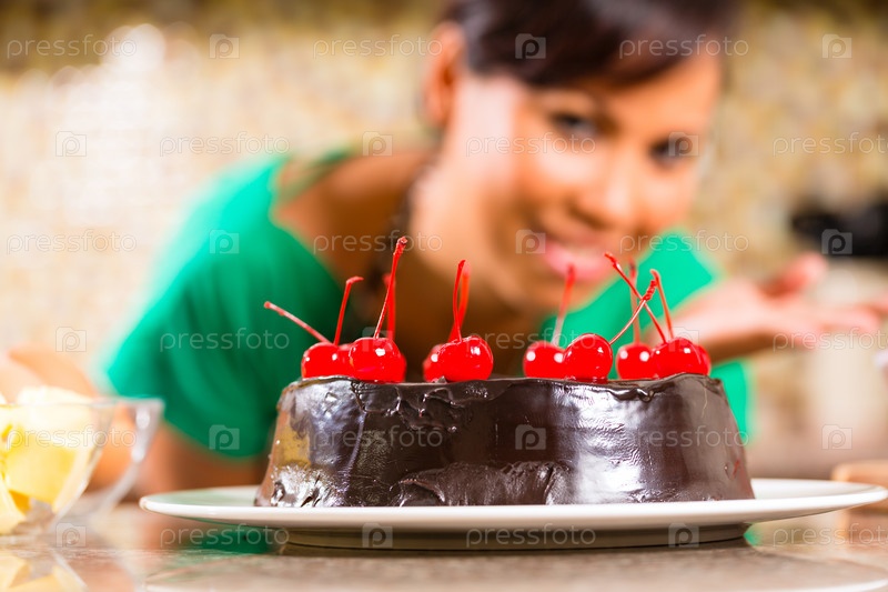Азиатская женщина подает домашний торт с вишнями