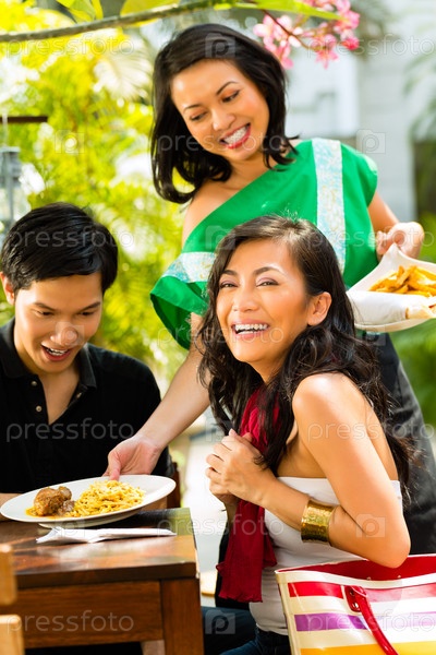 Азиатские мужчина и женщина в ресторане или кафе. Официантка подает блюдо