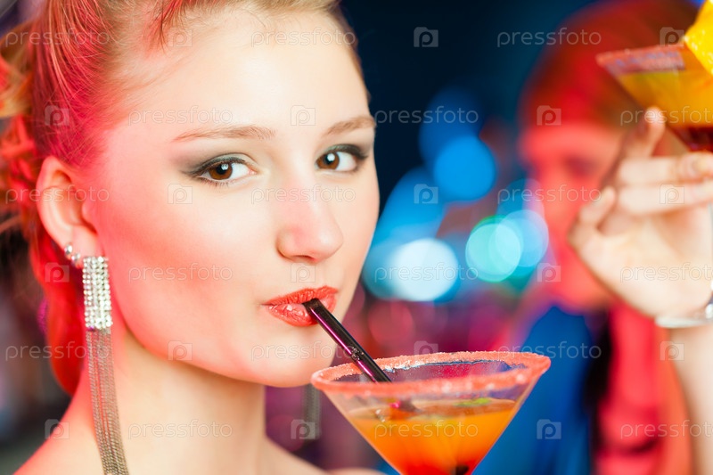 Веселые молодые женщины в баре пьют коктейли