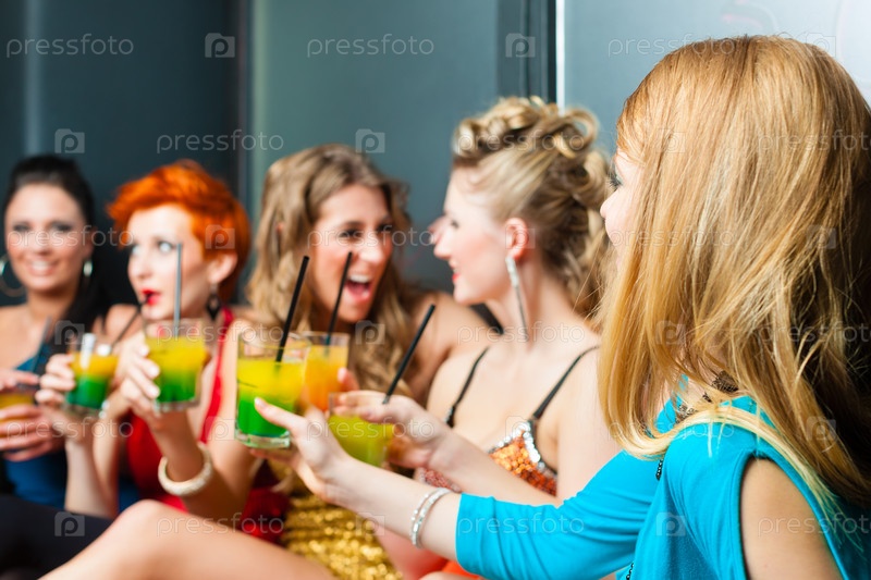 Веселые молодые женщины в баре пьют коктейли