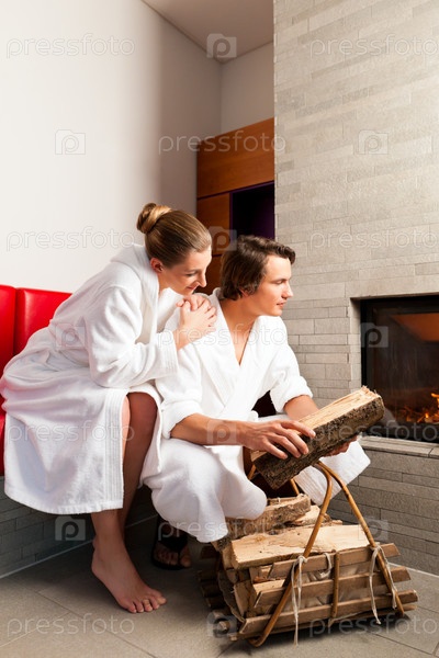 Молодая пара сидит в халатах перед камином