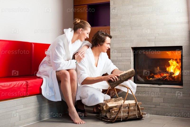 Молодая пара сидит в халатах перед камином