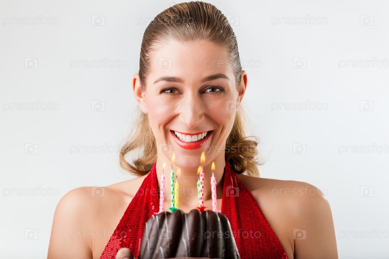 Женщина празднует день рождения с тортом и свечами