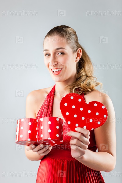 Женщина с подарочной коробкой в форме сердца на день рождения или День Святого Валентина