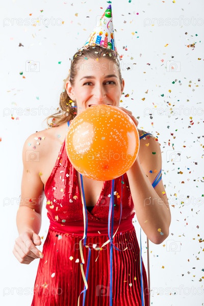 Улыбающаяся женщина празднует день рождения с конфетти и воздушным шариком